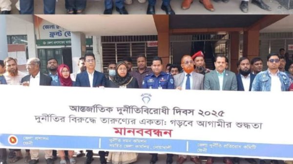 আন্তর্জাতিক দুর্নীতি বিরোধী দিবস উপলক্ষে আজ ৯ ডিসেম্বর ২০২৫ ফেনী জেলা প্রশাসনের আয়োজনে জেলা প্রশাসকের কার্যালয় প্রাঙ্গণে সরকারি নির্দেশনা অনুযায়ী বর্ণাঢ্য মানববন্ধন কর্মসূচি অনুষ্ঠিত হয়েছে। জেলার বিভিন্ন সরকারি দপ্তরের কর্মকর্তা-কর্মচারীরা স্বতঃস্ফূর্তভাবে এ কর্মসূচিতে অংশগ্রহণ করেন। অনুষ্ঠানে মান্যবর সিভিল সার্জন ডা. মোহাম্মদ রুবাইয়াত বিন করিমের নেতৃত্বে ফেনী সিভিল সার্জন কার্যালয়ের কর্মকর্তা-কর্মচারীরা সক্রিয়ভাবে উপস্থিত ছিলেন। দুর্নীতি প্রতিরোধ, স্বচ্ছতা, জবাবদিহিতা ও সুশাসন প্রতিষ্ঠার অঙ্গীকারকে সামনে রেখে এ কর্মসূচির আয়োজন করা হয়। মানববন্ধন শুরুর আগে ফেনী শিল্পকলা একাডেমির শিক্ষার্থীদের অংশগ্রহণে জাতীয় সংগীত পরিবেশন করা হয়, যা পুরো অনুষ্ঠানে এক গাম্ভীর্যপূর্ণ পরিবেশ সৃষ্টি করে। এরপর জাতীয় পতাকা ও দুর্নীতি দমন কমিশনের (দুদক) পতাকা উত্তোলন করা হয়।