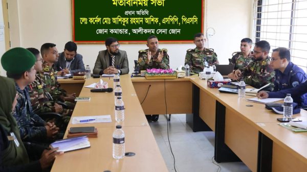 আসন্ন ত্রয়োদশ জাতীয় সংসদ নির্বাচনকে কেন্দ্র করে সার্বিক আইন-শৃঙ্খলা ও নিরাপত্তা পরিস্থিতি পর্যালোচনা, আন্তঃসংস্থার সমন্বয় জোরদার এবং কার্যকর যোগাযোগ নিশ্চিত করতে বাংলাদেশ সেনাবাহিনীর আলীকদম সেনা জোনের উদ্যোগে বিশেষ আইন-শৃঙ্খলা ও নিরাপত্তা সভা এবং সাংবাদিকদের সঙ্গে মতবিনিময় সভা অনুষ্ঠিত হয়েছে। বৃহস্পতিবার (৫ ফেব্রুয়ারি ২০২৬) সকাল ১১টা থেকে দুপুর ২টা পর্যন্ত লামা উপজেলা পরিষদ হলরুমে আয়োজিত সভায় সভাপতিত্ব করেন লামা উপজেলা নির্বাহী কর্মকর্তা মোঃ মঈন উদ্দিন। সভায় প্রধান অতিথি হিসেবে উপস্থিত ছিলেন আলীকদম সেনা জোনের জোন কমান্ডার লেফটেন্যান্ট কর্নেল মোঃ আশিকুর রহমান আশিক, এসপিপি, পিএসসি (অধিনায়ক, ৩১ বীর)।