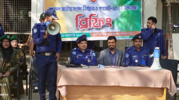 প্যারেডে অফিসার ইনচার্জ আলমগীর হোসেন শাহের সঞ্চালনায় অতিরিক্ত পুলিশ সুপার মোঃ ফরহাদ সরদার পিপিএম এবং উপজেলা নির্বাহী অফিসার মনজুর আলম নির্বাচনী আচরণবিধি, আইনশৃঙ্ঙ্খলা রক্ষা, দায়িত্ব ও কর্তব্য পালনে সতর্কতা বিষয়ে দিকনির্দেশনামূলক বক্তব্য প্রদান করেন। বক্তারা অবাধ, সুষ্ঠু ও শান্তিপূর্ণ নির্বাচন নিশ্চিত করতে সকল সদস্যকে পেশাদারিত্ব, নিরপেক্ষতা ও সর্বোচ্চ সতর্কতার সঙ্গে দায়িত্ব পালনের আহ্বান জানান।