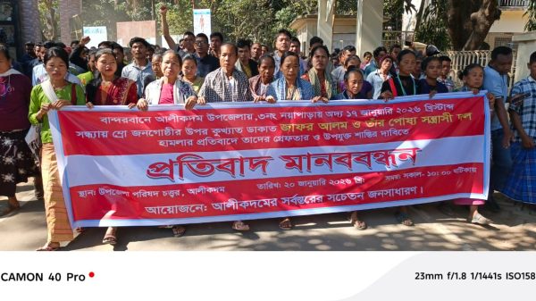 বান্দরবান পার্বত্য জেলার আলীকদম উপজেলায় ম্রো সম্প্রদায়ের ওপর সন্ত্রাসী হামলার প্রতিবাদে বিক্ষোভ মিছিল ও মানববন্ধন অনুষ্ঠিত হয়েছে। আসামিদের দ্রুত গ্রেফতার এবং দোষীদের উপযুক্ত শাস্তির দাবিতে এ কর্মসূচির আয়োজন করা হয়। মঙ্গলবার (২০ জানুয়ারি ২০২৬) সকাল ১০টা ৩০ মিনিট থেকে ১১টা ৩০ মিনিট পর্যন্ত আলীকদম উপজেলা পরিষদ চত্বরে ম্রো সম্প্রদায়সহ বিভিন্ন উপজাতি সম্প্রদায়ের উদ্যোগে এবং আলীকদম উপজেলার সর্বস্তরের সচেতন জনসাধারণের অংশগ্রহণে মানববন্ধন ও বিক্ষোভ কর্মসূচি পালন করা হয়। উল্লেখ্য, গত ১৭ জানুয়ারি ২০২৬ খ্রিষ্টাব্দ সন্ধ্যা আনুমানিক ৭টার দিকে আলীকদম উপজেলার ৩নং নয়াপাড়া ইউনিয়নে ম্রো জনগোষ্ঠীর ওপর কুখ্যাত ডাকাত জাফর আলম ও তার পোষ্য সন্ত্রাসী বাহিনী হামলা চালায় বলে অভিযোগ ওঠে। ওই ঘটনার প্রতিবাদেই এ কর্মসূচির আয়োজন করা হয়।