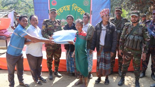 আলীকদম সেনা জোনের উদ্যোগে কুরুকপাতা ইউনিয়নের সীমান্তবর্তী দুর্গম পাহাড়ি এলাকায় ১০০ পরিবারে শীতবস্ত্র বিতরণ