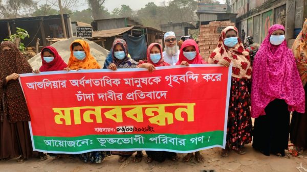 আশুলিয়ায় নারী-শিশুসহ পরিবার গৃহবন্দি, মানববন্ধনে প্রশাসনের হস্তক্ষেপ দাবি।