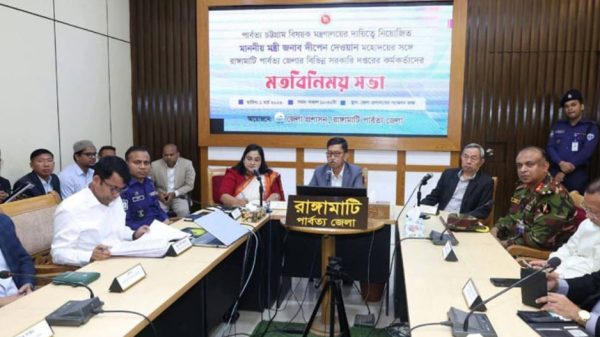 এসব প্রকল্প বাস্তবায়িত হলে পার্বত্য অঞ্চলের মানুষের জীবনমান উন্নত হবে বলে আশাবাদ ব্যক্ত করেন মন্ত্রী। জেলা পরিষদ নির্বাচন প্রসঙ্গে তিনি বলেন, বিষয়টি সরকারের সক্রিয় বিবেচনায় রয়েছে এবং শিগগিরই এ বিষয়ে সিদ্ধান্ত জানানো হবে। মতবিনিময় সভায় উপস্থিত ছিলেন রাঙামাটির জেলা প্রশাসক নাজমা আশরাফী, সাবেক পার্বত্য উপমন্ত্রী মনিস্বপন দেওয়ান, জেলা বিএনপির সভাপতি দীপন তালুকদার, সাধারণ সম্পাদক মামুনুর রশীদ ও সাবেক মেয়র সাইফুল ইসলাম চৌধুরীসহ বিভিন্ন রাজনৈতিক, সামাজিক ও পেশাজীবী নেতা। সভায় রাঙামাটির সড়ক যোগাযোগ, পানি ব্যবস্থাপনা, পর্যটন অবকাঠামো উন্নয়ন, কর্মসংস্থান সৃষ্টি ও পরিবেশ সুরক্ষাসহ বিভিন্ন সমস্যা ও সম্ভাবনার বিষয় তুলে ধরা হয়। এর আগে সকালে জেলার সরকারি দপ্তরের ঊর্ধ্বতন কর্মকর্তাদের সঙ্গে পৃথক সভায় চলমান প্রকল্পের অগ্রগতি পর্যালোচনা ও আন্তঃদপ্তর সমন্বয় জোরদারের ওপর গুরুত্বারোপ করেন মন্ত্রী।