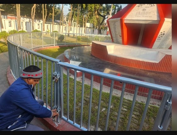 শহীদ বুদ্ধিজীবী দিবসে পাবনার মুক্তিযুদ্ধের স্মৃতিসৌধ ‘দূর্জয় পাবনা’ তালাবদ্ধ অবস্থায় পাওয়ায় ক্ষোভ ও বিস্ময় প্রকাশ করেছেন সাংবাদিকরা। ফুল দিয়ে শ্রদ্ধা জানাতে গিয়ে স্মৃতিসৌধে তালা ঝুলতে দেখে তারা তীব্র প্রতিক্রিয়া জানান। রোববার (১৪ ডিসেম্বর) শহীদ বুদ্ধিজীবী দিবস উপলক্ষে পুষ্পস্তবক অর্পণের জন্য পদযাত্রা নিয়ে পাবনা প্রেসক্লাবের সাংবাদিকরা ‘দূর্জয় পাবনা’ স্মৃতিসৌধে উপস্থিত হন। এ সময় স্মৃতিসৌধের ভেতর ও বাইরে মোট পাঁচটি তালা ঝুলতে দেখা যায়। এতে উপস্থিত সাংবাদিকদের মধ্যে ক্ষোভ ও হতাশা ছড়িয়ে পড়ে। সাংবাদিকদের সেখানে দাঁড়িয়ে থাকতে দেখে জেলা প্রশাসক কার্যালয়ের কর্মচারী ওয়াজেদ মিয়া ও আরদালী সুজন মিয়া ঘটনাস্থলে আসেন। সাংবাদিকরা গেটের বাইরে পুষ্পস্তবক অর্পণের উদ্যোগ নিলে কিছুক্ষণ পর একজন কর্মচারী একগুচ্ছ চাবি নিয়ে এসে তালা খুলে দেন। নাম প্রকাশ না করার শর্তে ওই কর্মচারী জানান, আজ শহীদ বুদ্ধিজীবী দিবস—এ তথ্য তার জানা ছিল না। জেলা প্রশাসকের কার্যালয় থেকেও স্মৃতিসৌধ খোলা রাখার কোনো নির্দেশনা দেওয়া হয়নি। তাই তালা খোলা হয়নি। জেলা প্রশাসক কার্যালয়ের স্টাফ ওয়াজেদ আলী বলেন, এটি আমাদের চেতনার বিষয়। আমরা বুকে ও মনে এই চেতনা লালন করি। তবে কর্মচারীদের আগে থেকে জানানো হয়নি কেন—তা আমার জানা নেই। পাবনা প্রেসক্লাবের সাধারণ সম্পাদক জহুরুল ইসলাম বলেন, এমন দৃশ্য দেখতে হবে—এটা কল্পনাও করিনি। মহান মুক্তিযুদ্ধে জাতিকে মেধাশূন্য করতে শিক্ষক, সাংবাদিক, লেখক ও বুদ্ধিজীবীদের হত্যা করা হয়েছিল। সেই আত্মত্যাগের স্মরণে শহীদ বুদ্ধিজীবী দিবস পালন করা হয়। অথচ আজ সেই চেতনার এমন অবস্থা জেলা প্রশাসনের চরম দায়িত্বহীনতা ও উদাসীনতারই প্রমাণ।