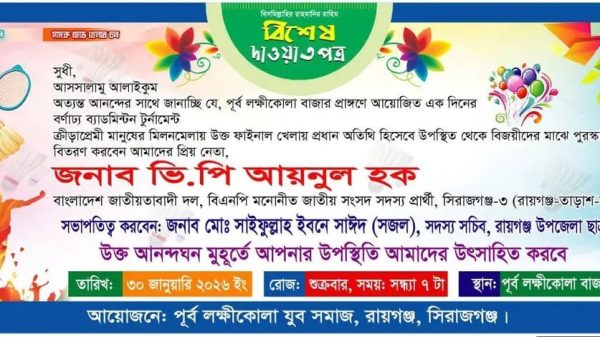 সিরাজগঞ্জের রায়গঞ্জ উপজেলার পূর্ব লক্ষীকোলা বাজার প্রাঙ্গণে একদিনব্যাপী ব্যাডমিন্টন টুর্নামেন্টের ফাইনাল খেলা আজ শুক্রবার (৩০ জানুয়ারি) সন্ধ্যা ৭টায় অনুষ্ঠিত হবে। স্থানীয় সূত্রে জানা যায়, পূর্ব লক্ষীকোলা যুব সমাজের আয়োজনে অনুষ্ঠিত এই টুর্নামেন্টে এলাকার বিভিন্ন দলের অংশগ্রহণে প্রতিযোগিতামূলক খেলা অনুষ্ঠিত হয়। দীর্ঘদিন পর এমন ক্রীড়া আয়োজনকে ঘিরে স্থানীয় যুবসমাজ ও ক্রীড়াপ্রেমীদের মধ্যে ব্যাপক উৎসাহ-উদ্দীপনা দেখা গেছে। ফাইনাল খেলায় প্রধান অতিথি হিসেবে উপস্থিত থেকে বিজয়ীদের মাঝে পুরস্কার বিতরণ করবেন বিএনপি মনোনীত জাতীয় সংসদ সদস্য প্রার্থী, সিরাজগঞ্জ-৩ (রায়গঞ্জ–তাড়াশ–সলঙ্গা) আসনের জনাব ভি.পি. আয়নুল হক।