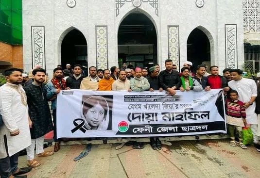 বাংলাদেশ জাতীয়তাবাদী দলের সাবেক প্রধানমন্ত্রী ও আপোষহীন দেশনেত্রী বেগম খালেদা জিয়ার আত্মার মাগফেরাত কামনায় ফেনী জেলা ছাত্রদলের উদ্যোগে বিশেষ মিলাদ ও দোয়ার মাহফিল অনুষ্ঠিত হয়েছে। শুক্রবার জুমার নামাজের পর ফেনী শহরের ঐতিহ্যবাহী বড় জামে মসজিদে এ দোয়া মাহফিলের আয়োজন করা হয়। এতে ফেনী জেলা ছাত্রদলের নেতৃবৃন্দসহ বিভিন্ন শ্রেণি-পেশার ধর্মপ্রাণ মুসল্লিরা অংশগ্রহণ করেন।