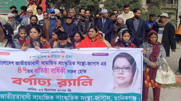 বাংলাদেশ জাতীয়তাবাদী সামাজিক সাংস্কৃতিক সংস্থা (জাসাস)-এর ৪৭তম প্রতিষ্ঠাবার্ষিকী উপলক্ষে মানিকগঞ্জ জেলা জাসাস বর্ণাঢ্য কর্মসূচির মধ্য দিয়ে দিবসটি উদযাপন করেছে। মানিকগঞ্জ জেলা বিএনপির সফল আহ্বায়ক আফরোজা খানম রিতা-র দিকনির্দেশনায় আজ দিনব্যাপী এ আয়োজন সম্পন্ন হয়। উদযাপন অনুষ্ঠানে প্রধান অতিথি হিসেবে উপস্থিত ছিলেন মানিকগঞ্জ জেলা জাসাসের সিনিয়র যুগ্ম আহ্বায়ক মোঃ ওহিদুল ইসলাম লোটাস। বিশেষ অতিথি হিসেবে ছিলেন মুনজুর আলম পালু ও জিয়াউল ইসলাম শাওন, যুগ্ম আহ্বায়ক মানিকগঞ্জ জেলা জাসাস। মানিকগঞ্জ জেলা জাসাসের সদস্য সচিব মোঃ শামীম বিশ্বাস শারীরিক অসুস্থতার কারণে অনুষ্ঠানে উপস্থিত হতে না পারায় তার সুস্থতার জন্য দোয়া করা হয়। এছাড়া সাটুরিয়া উপজেলা জাসাসের সভাপতি ও সাধারণ সম্পাদকসহ মানিকগঞ্জ জেলার বিভিন্ন উপজেলা জাসাসের সভাপতি ও সাধারণ সম্পাদকবৃন্দ এবং বিএনপির সকল অঙ্গ ও সহযোগী সংগঠনের নেতাকর্মীরা উপস্থিত ছিলেন। অনুষ্ঠানটি সঞ্চালনা করেন মোঃ জিয়াউল ইসলাম শাওন, যুগ্ম আহ্বায়ক মানিকগঞ্জ জেলা জাসাস।