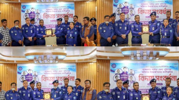 পার্বত্য জেলা বান্দরবানে জেলা পুলিশের আয়োজনে জেলার সকল থানার অফিসার ইনচার্জদের (ওসি) বদলি-জনিত বিদায় উপলক্ষে এক সংবর্ধনা অনুষ্ঠান অনুষ্ঠিত হয়েছে। শনিবার (০৬ ডিসেম্বর ২০২৫) পুলিশ সুপারের কার্যালয়ের সম্মেলন কক্ষে এ অনুষ্ঠান আয়োজন করা হয়।