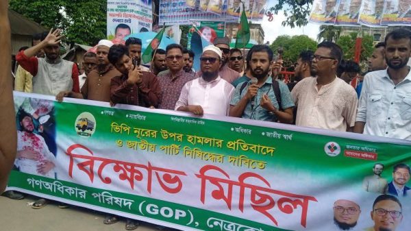 ভিপি নূরের উপর হামলার প্রতিবাদে নেত্রকোনায় বিক্ষোভ প্রতিবাদ