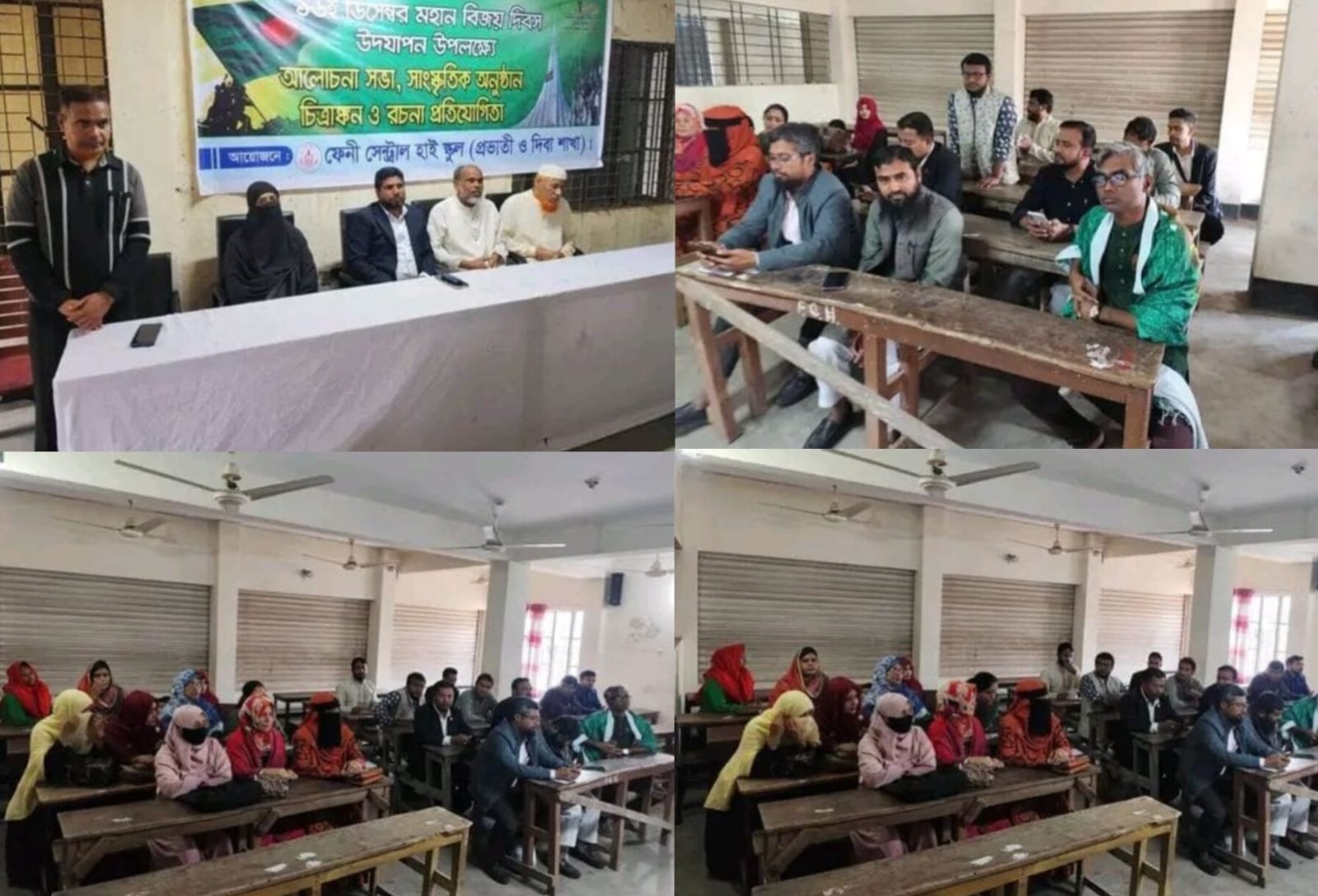 মহান বিজয় দিবস উপলক্ষে ফেনী সেন্ট্রাল হাই স্কুলে যথাযোগ্য মর্যাদা ও গভীর ভাবগাম্ভীর্যের মধ্য দিয়ে আলোচনা সভা ও সাংস্কৃতিক অনুষ্ঠানের আয়োজন করা হয়েছে। জাতির ইতিহাসের এই গৌরবময় দিনে বিদ্যালয় প্রাঙ্গণ জাতীয় পতাকা, ব্যানার ও আলোকসজ্জায় সজ্জিত করা হয়। শিক্ষক-শিক্ষার্থী ও আমন্ত্রিত অতিথিদের স্বতঃস্ফূর্ত অংশগ্রহণে অনুষ্ঠানটি এক আবেগঘন ও প্রেরণাদায়ী পরিবেশে অনুষ্ঠিত হয়।অনুষ্ঠানের শুরুতে মহান মুক্তিযুদ্ধের বীর শহীদদের প্রতি গভীর শ্রদ্ধা নিবেদন করে জাতীয় সংগীত পরিবেশন ও জাতীয় পতাকা উত্তোলন করা হয়। এরপর বিদ্যালয়ের প্রধান শিক্ষক সভাপতির বক্তব্যে মহান মুক্তিযুদ্ধের ঐতিহাসিক প্রেক্ষাপট, ১৯৭১ সালের নয় মাসের রক্তক্ষয়ী সংগ্রাম এবং স্বাধীনতা অর্জনে বাঙালি জাতির অসামান্য আত্মত্যাগের কথা গুরুত্বসহকারে তুলে ধরেন। তিনি শিক্ষার্থীদের উদ্দেশে বলেন, মুক্তিযুদ্ধের চেতনায় উদ্বুদ্ধ হয়ে সুশিক্ষিত, দেশপ্রেমিক ও মানবিক নাগরিক হিসেবে গড়ে ওঠাই হওয়া উচিত বিজয় দিবসের মূল অঙ্গীকার।
