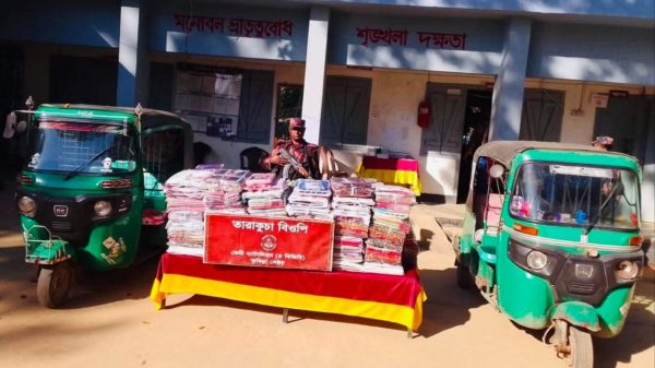 ফুলগাজীর তারাকুচা সীমান্তে বিজিবির অভিযান—৪৩৯ পিস ভারতীয় শাড়ী জব্দ, আটক ২ সিএনজি
