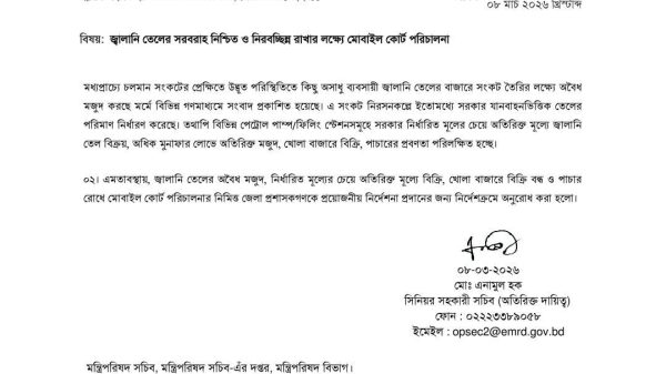 সরকার দেশজুড়ে জ্বালানি তেলের সরবরাহ স্বাভাবিক ও নিরবচ্ছিন্ন রাখতে মোবাইল কোর্ট পরিচালনার নির্দেশ দিয়েছে। এই নির্দেশনা বিদ্যুৎ, জ্বালানি ও খনিজ সম্পদ মন্ত্রণালয়-এর জ্বালানি ও খনিজ সম্পদ বিভাগ থেকে জারি করা হয়েছে। মন্ত্রণালয়ের অপারেশন-২ শাখা জানায়, মধ্যপ্রাচ্যে চলমান সংকটের প্রেক্ষিতে কিছু অসাধু ব্যবসায়ী জ্বালানি তেলের বাজারে কৃত্রিম সংকট তৈরি করতে অবৈধভাবে মজুদ করছে। এছাড়া অভিযোগ পাওয়া গেছে, বিভিন্ন পেট্রোল পাম্প ও ফিলিং স্টেশনে সরকার নির্ধারিত মূল্যের চেয়ে বেশি দামে জ্বালানি তেল বিক্রি, অতিরিক্ত মুনাফা অর্জন এবং পাচারের ঘটনা ঘটছে।